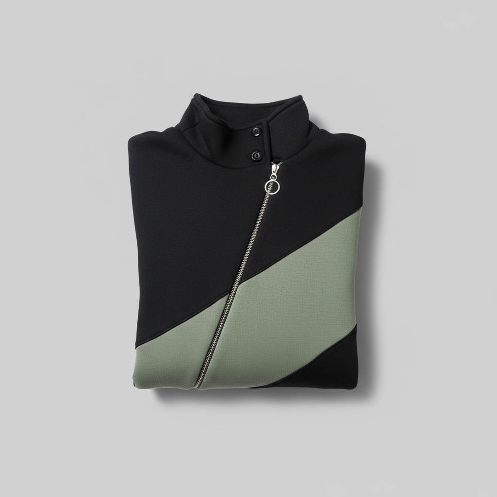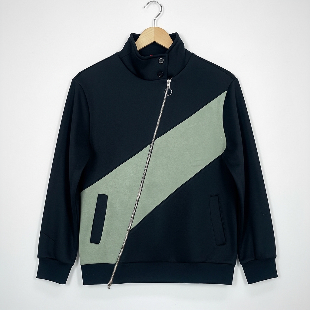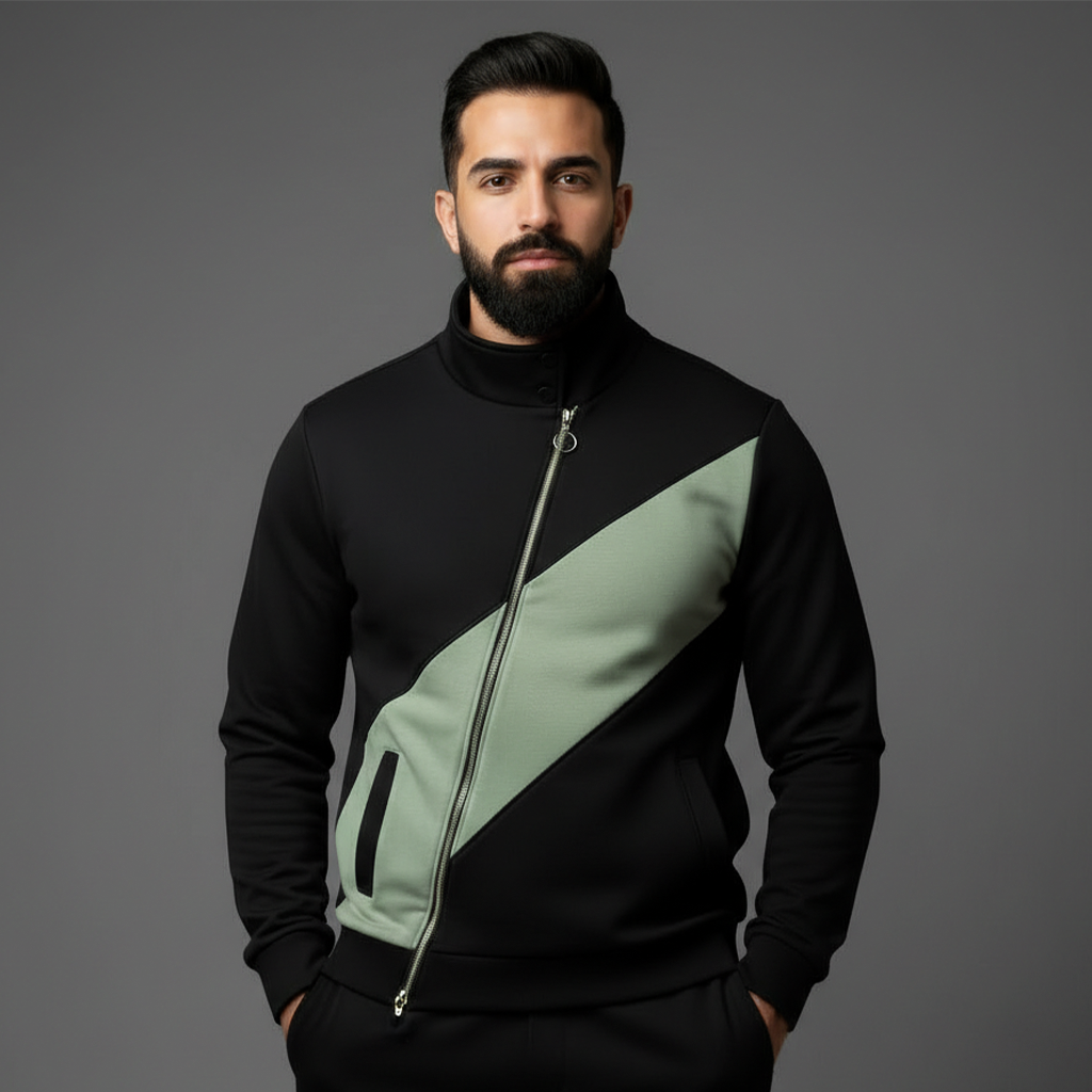 هودي بتصميم Asymmetrical (غير متماثل) بيخطف العين. دمجنا اللون الأسود الفخم مع خط عريض بلون “الزيتوني الهادي” (Sage Green) بشكل قطري (Diagonal) عشان يديك لوك مودرن وجريء.
